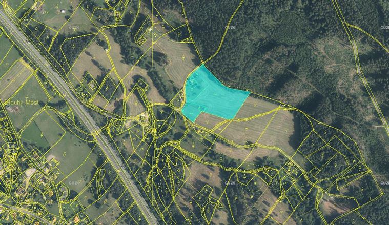 Předmětem dražby je dále spoluvlastnický podíl o velikosti id. 1/12 k pozemku parc.č. 789 - orná půda, o výměře 15.348 m2 a pozemku parc.č. 846 - trvalý travní porost, o výměře 2.891 m2, vše v k.ú. a obci Dlouhý Most, okres Liberec, které jsou situovány v odlehlé, severovýchodní části katastrálního území, ve sklonitém terénu a tvoří jednotný funkční celek s přístupem po veřejné zpevněné komunikaci. Pozemky jsou zemědělsky obdělávané a jsou součástí zemědělských honů.
